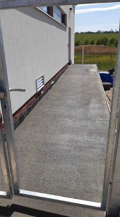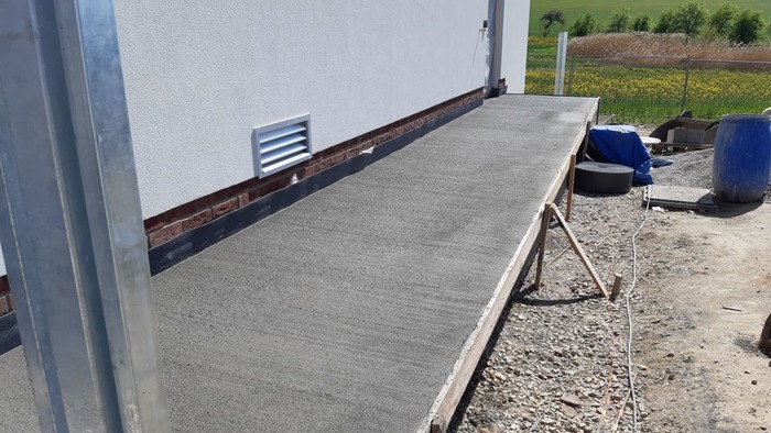 V Šumné jsme pro firemního zákazníka položili okolo stěny novostavby betonovou terasu, pochozí lávku. Jde o betonovou plochu s kartáčovaného betonu nebo také s kartáčovaným povrchem betonové plochy. Jde o protiskluzovou povrchovou úpravu zpevněné betonové plochy. Docílí se jí tak, že zavadlý beton na ploše se při srovnání strojně kartáčuje. Výsledný povrch betonové plochy je zdrsněný, beton je strojně zpevněný a má pevnost betonu.